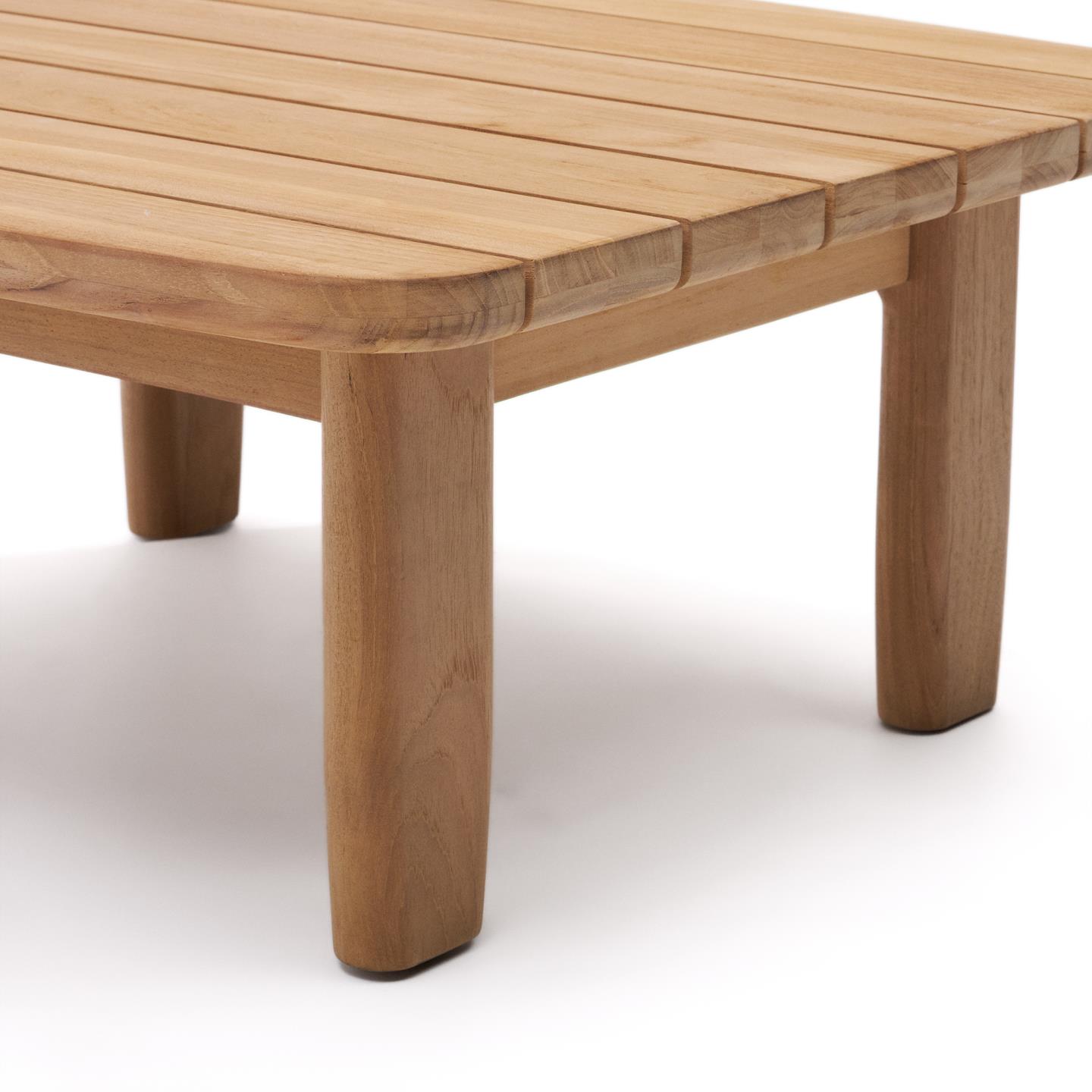 - Esta madeira maciça de teca tem um acabamento à base de água que lhe confere um tom claro e uma textura homogénea, mantendo a aparência original da madeira.