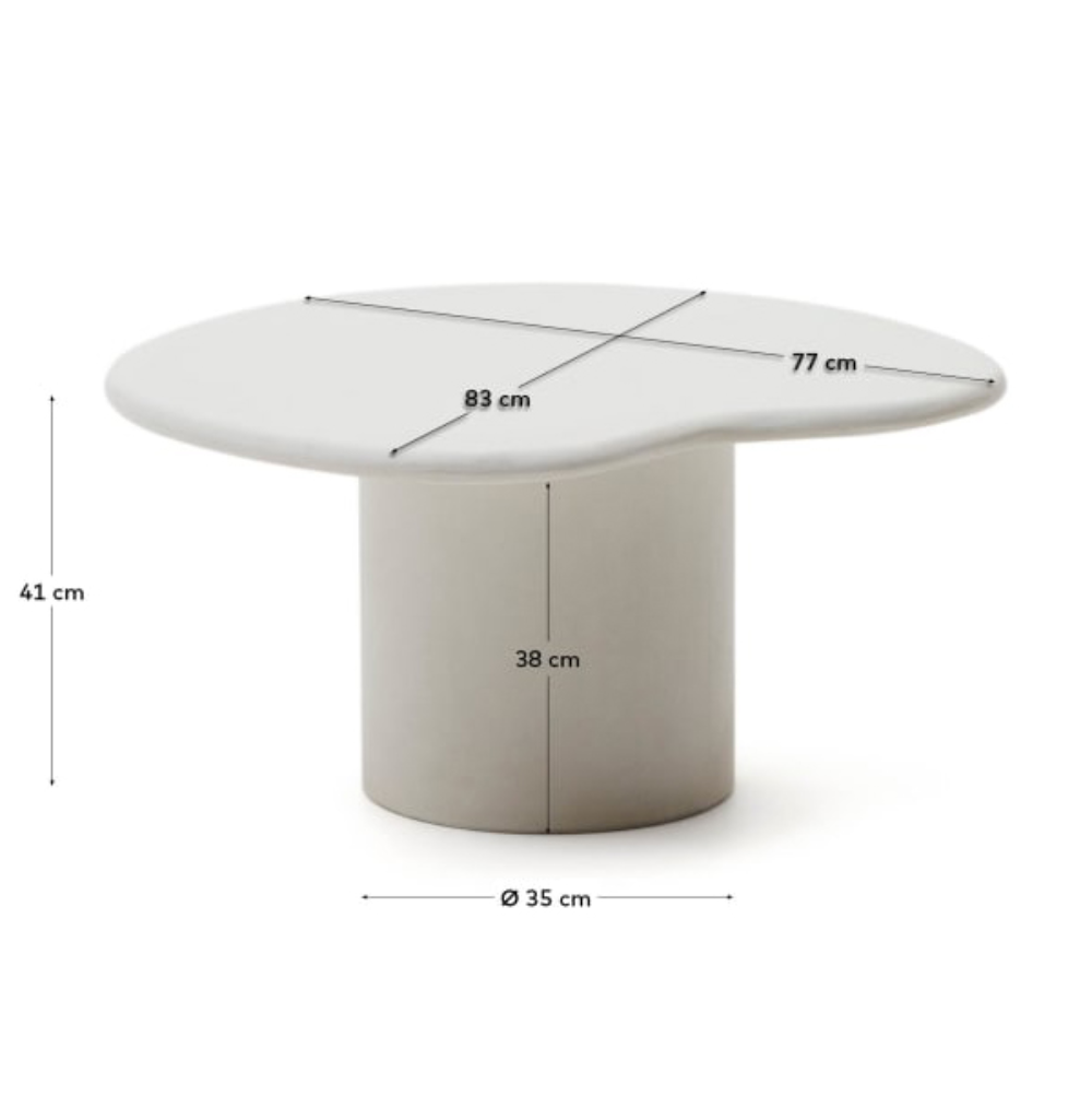 - Produzida em cimento branco com acabamento suave, combina um tampo de linhas fluidas com uma base cilíndrica sólida que transmite estabilidade e elegância.