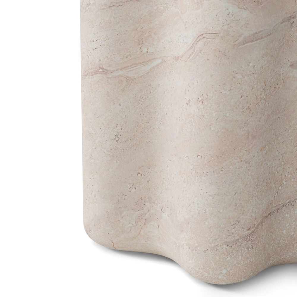 - Produzida em cimento com acabamento refinado em mármore travertino, esta peça destaca-se pela sua estética fluida e silhueta harmoniosa.