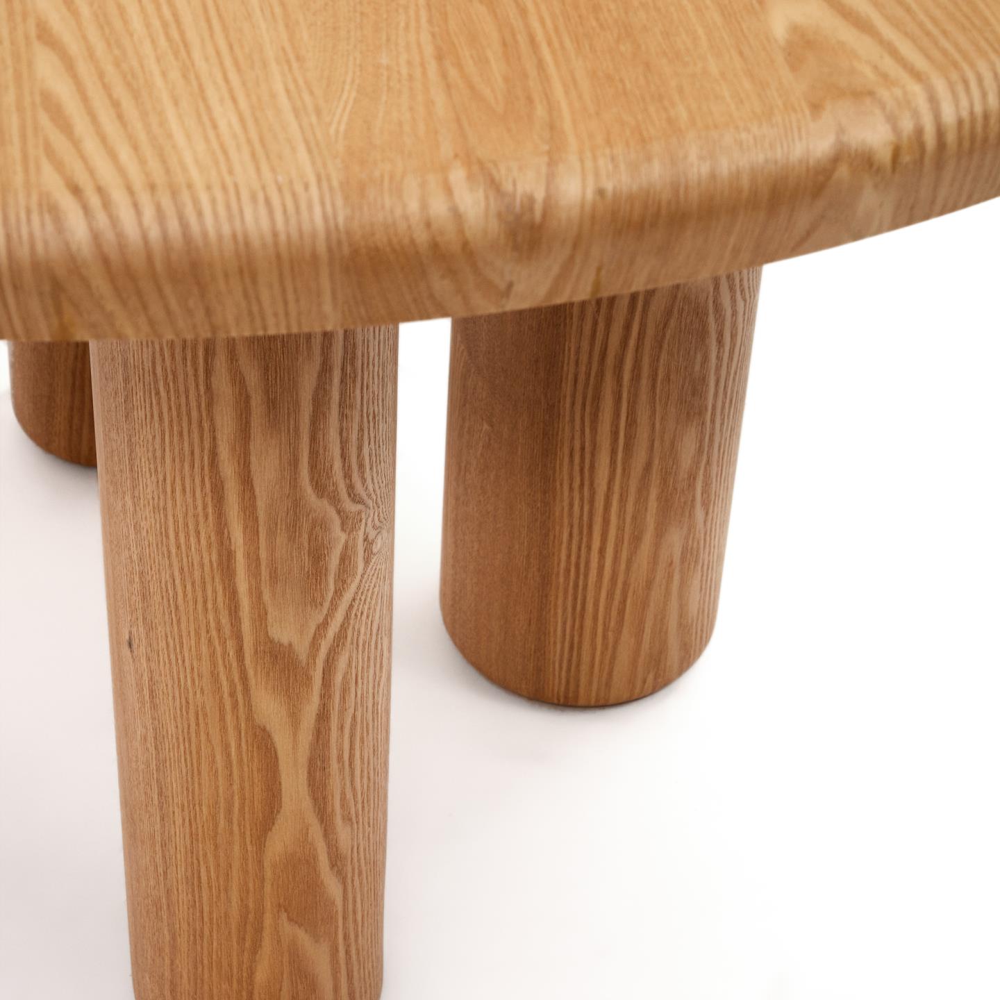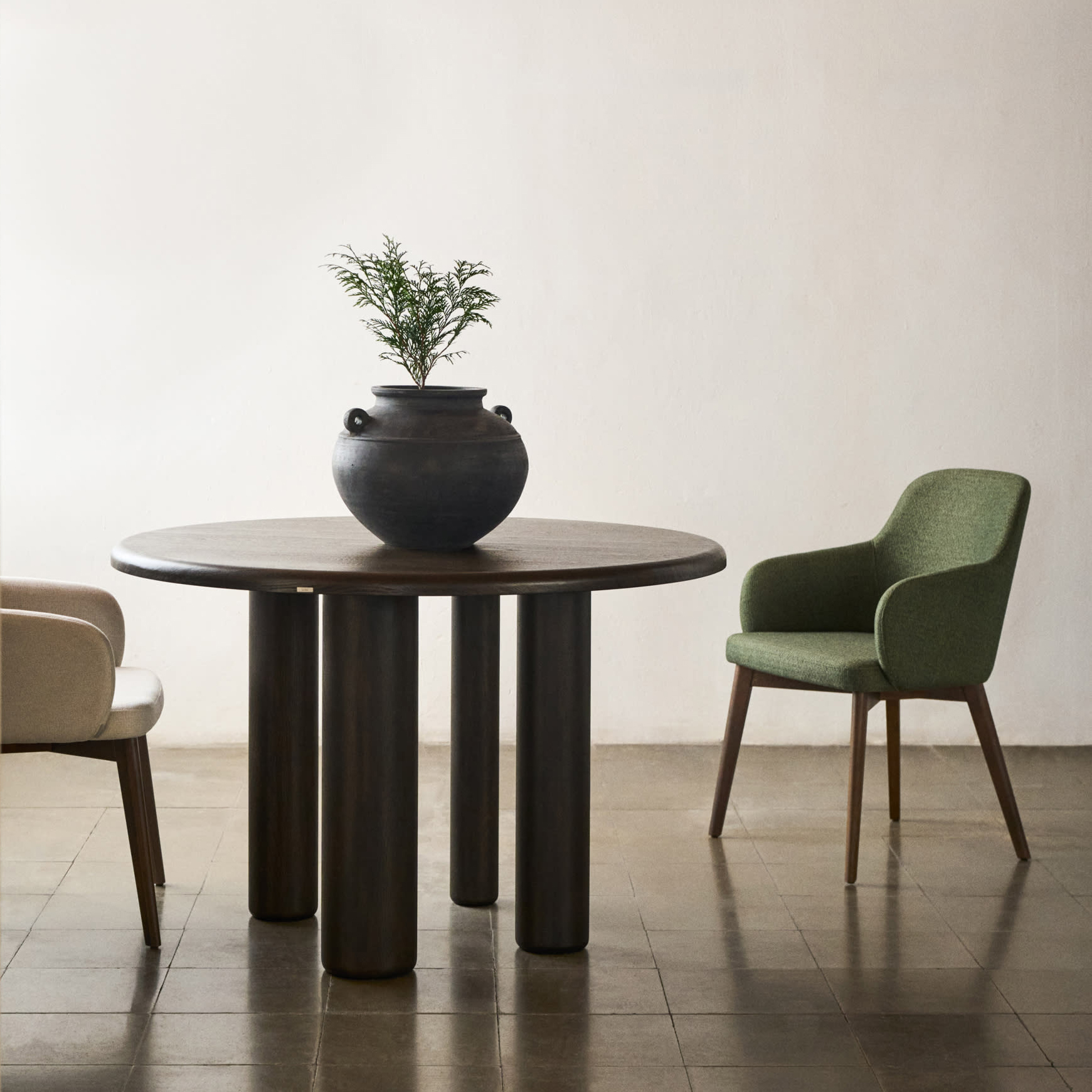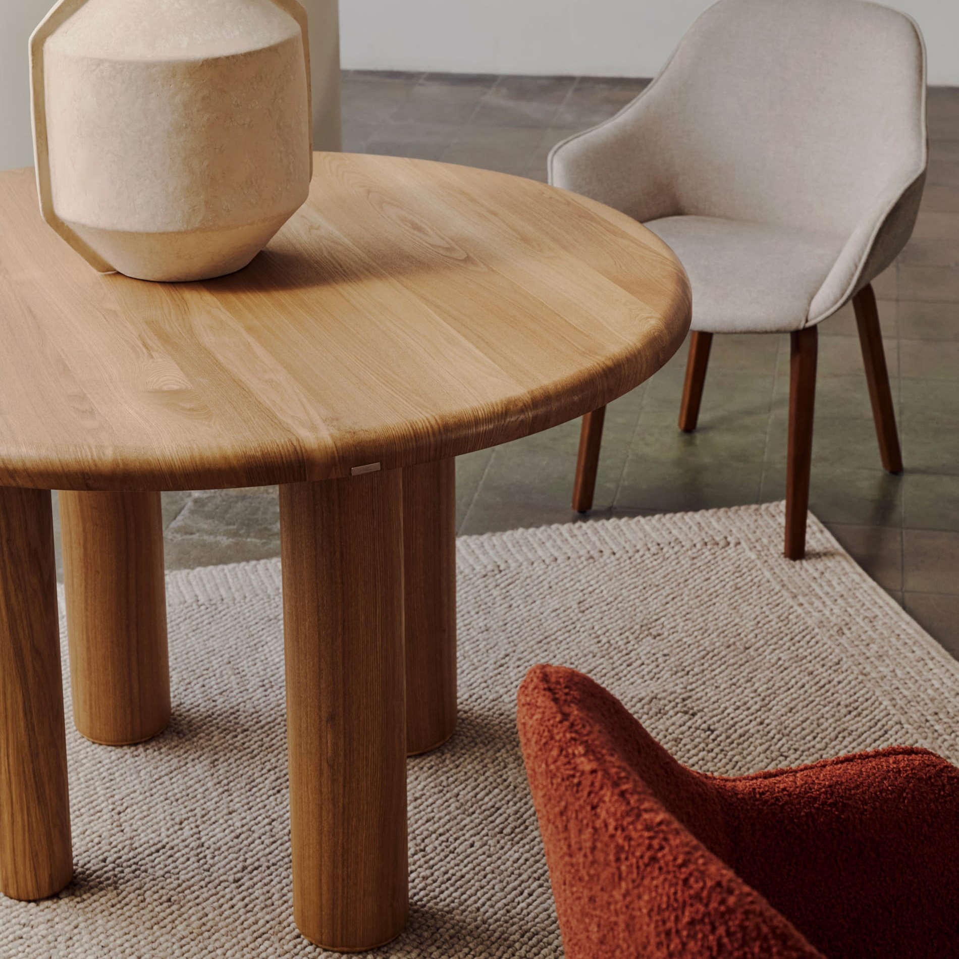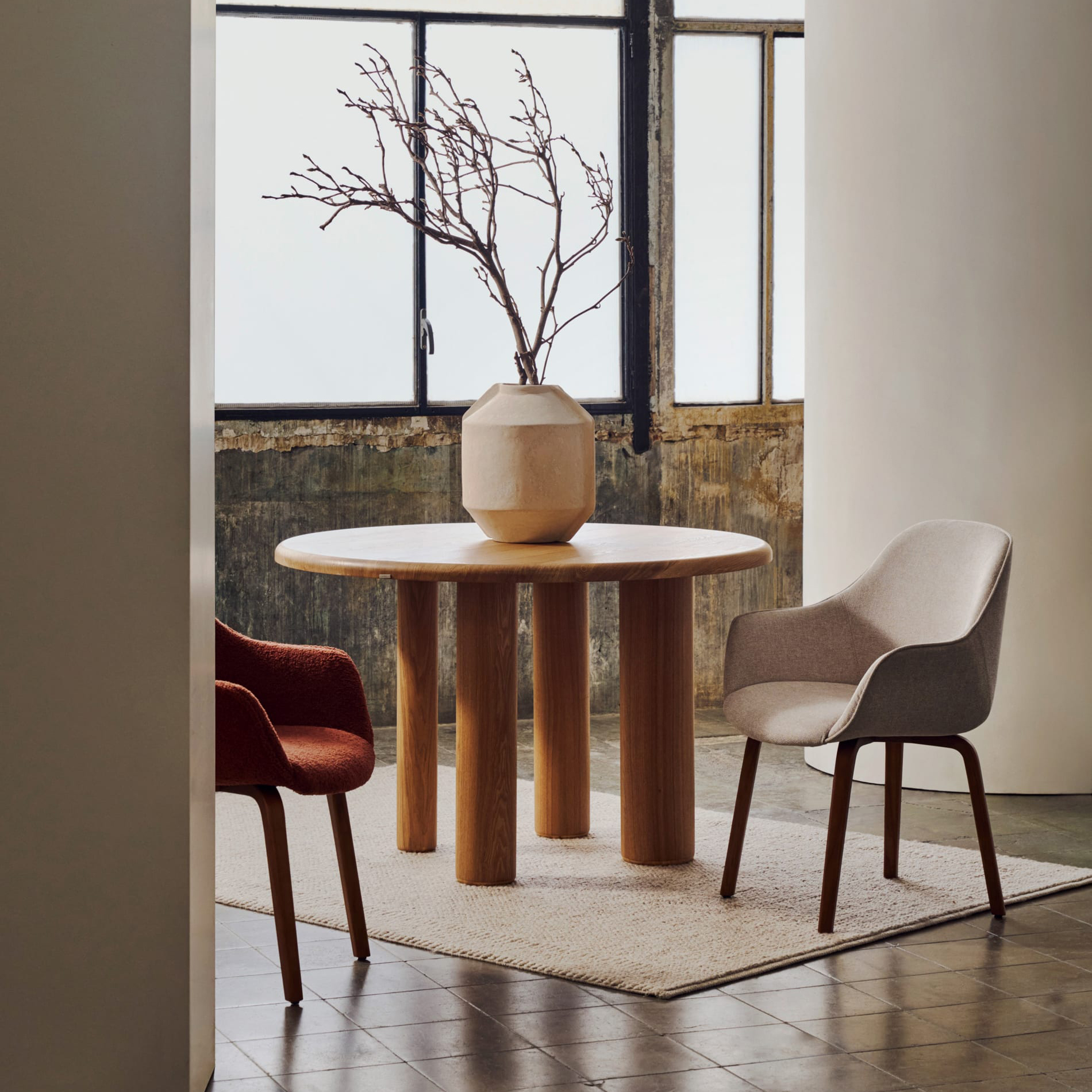 - Mesa redonda com tampo em chapa de freixo com acabamento natural.