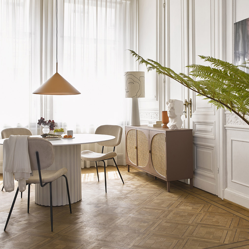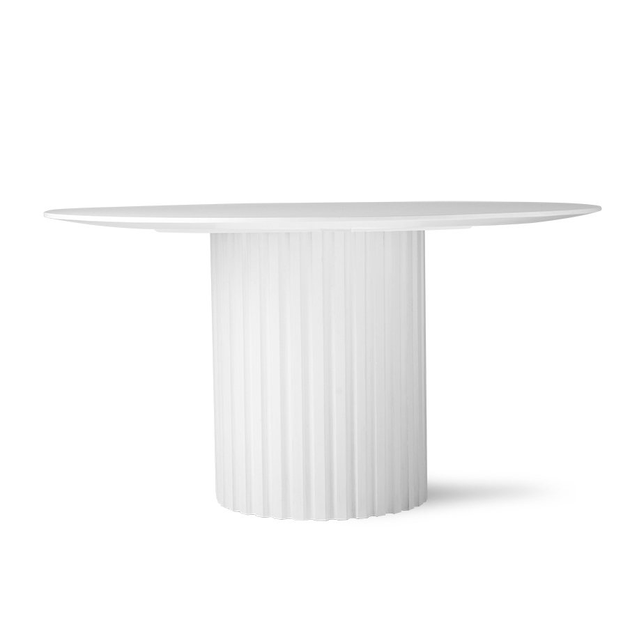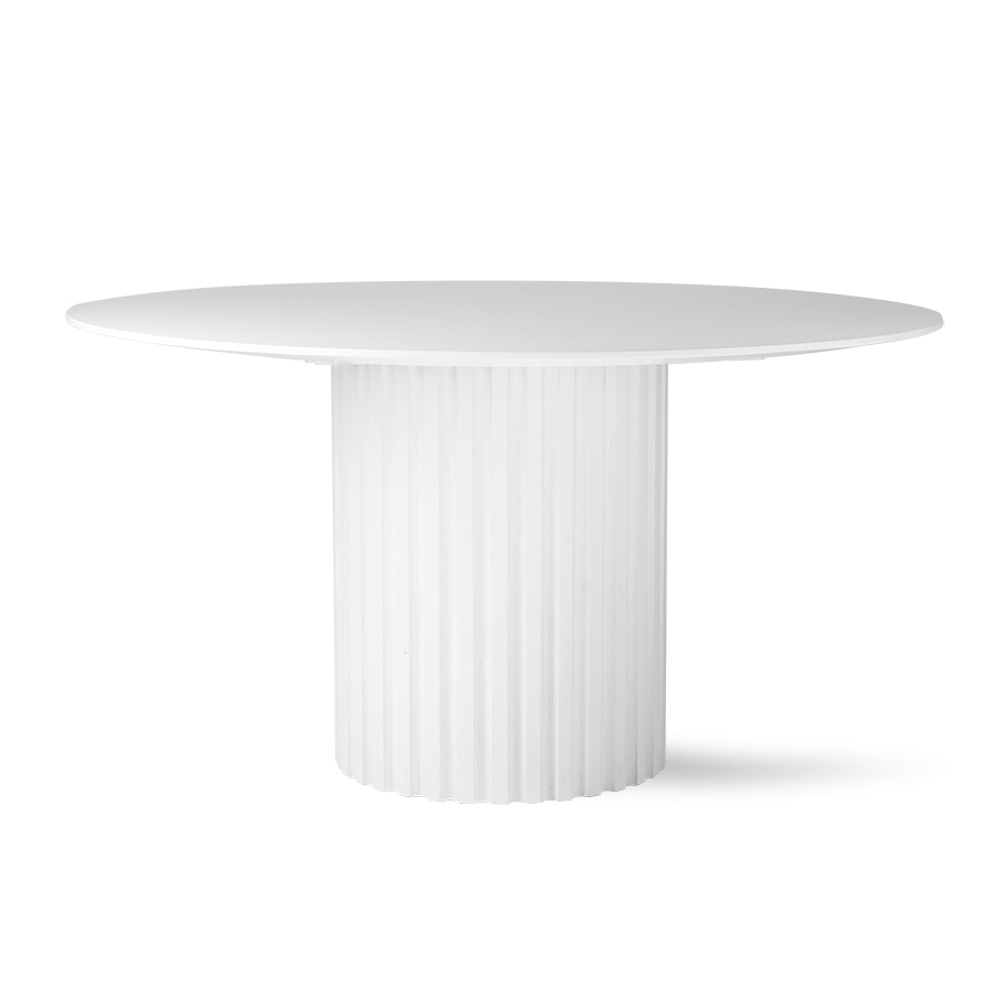 - A mesa de jantar Pillar da HK Living, destaca-se pela sua simplicidade, construção sólida e design funcional que confere-lhe uma qualidade intemporal, enquanto os sulcos verticais na base da mesa conferem-lhe um toque românico e decorativo.