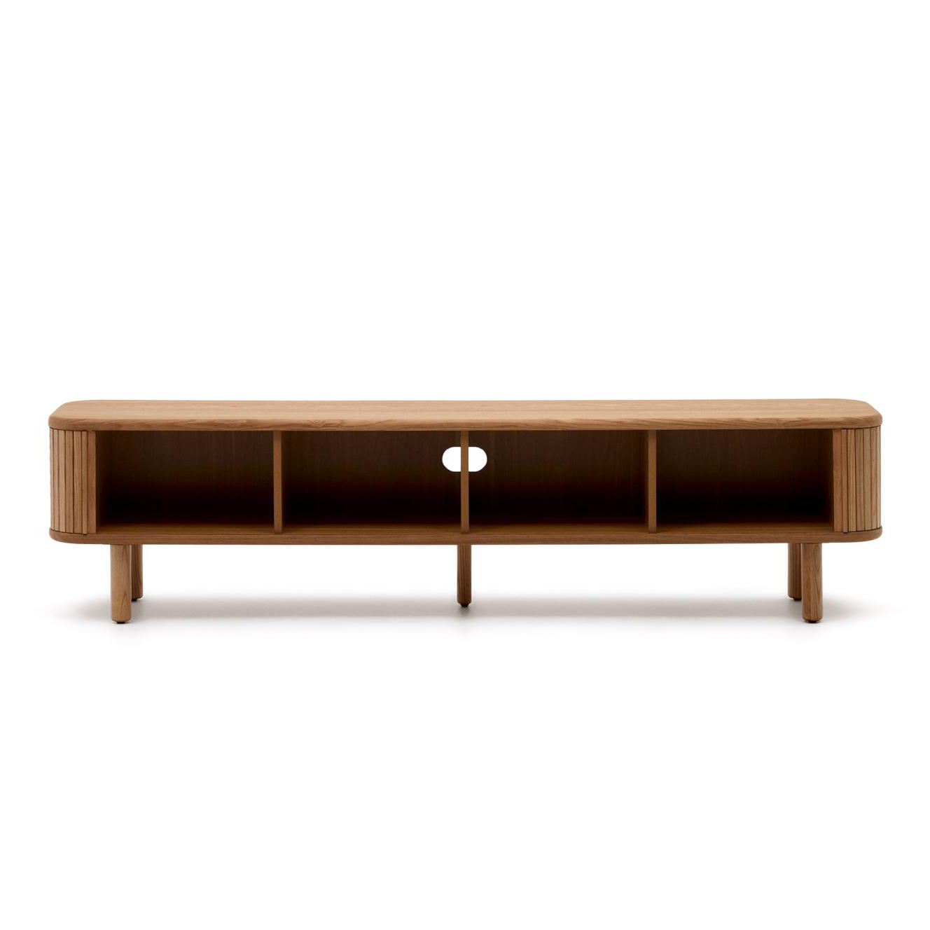 - Duas portas de correr tipo persiana em ripas de madeira para ocultar ou mostrar o interior do móvel.