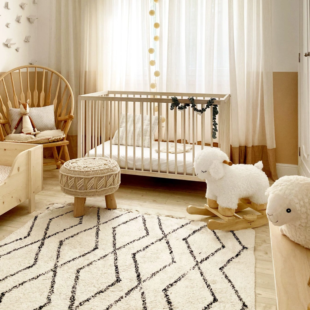 • Tapete branco com padrão geométrico preto num quarto infantil com berço e brinquedo de ovelha