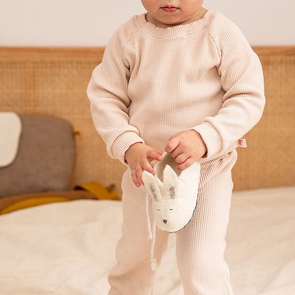 • Criança com pijama creme segurando pantufa de coelho