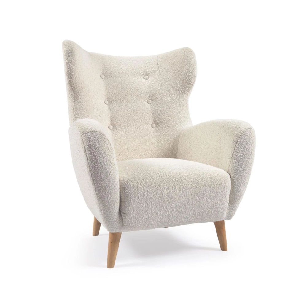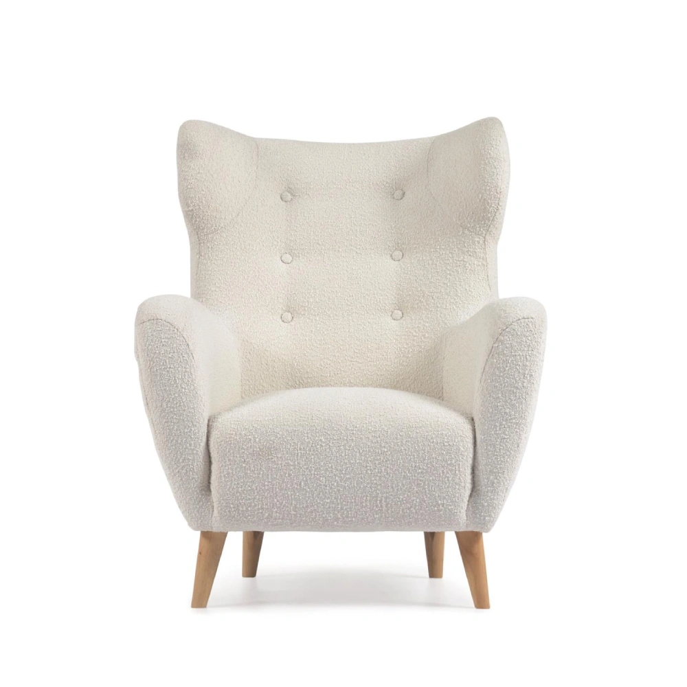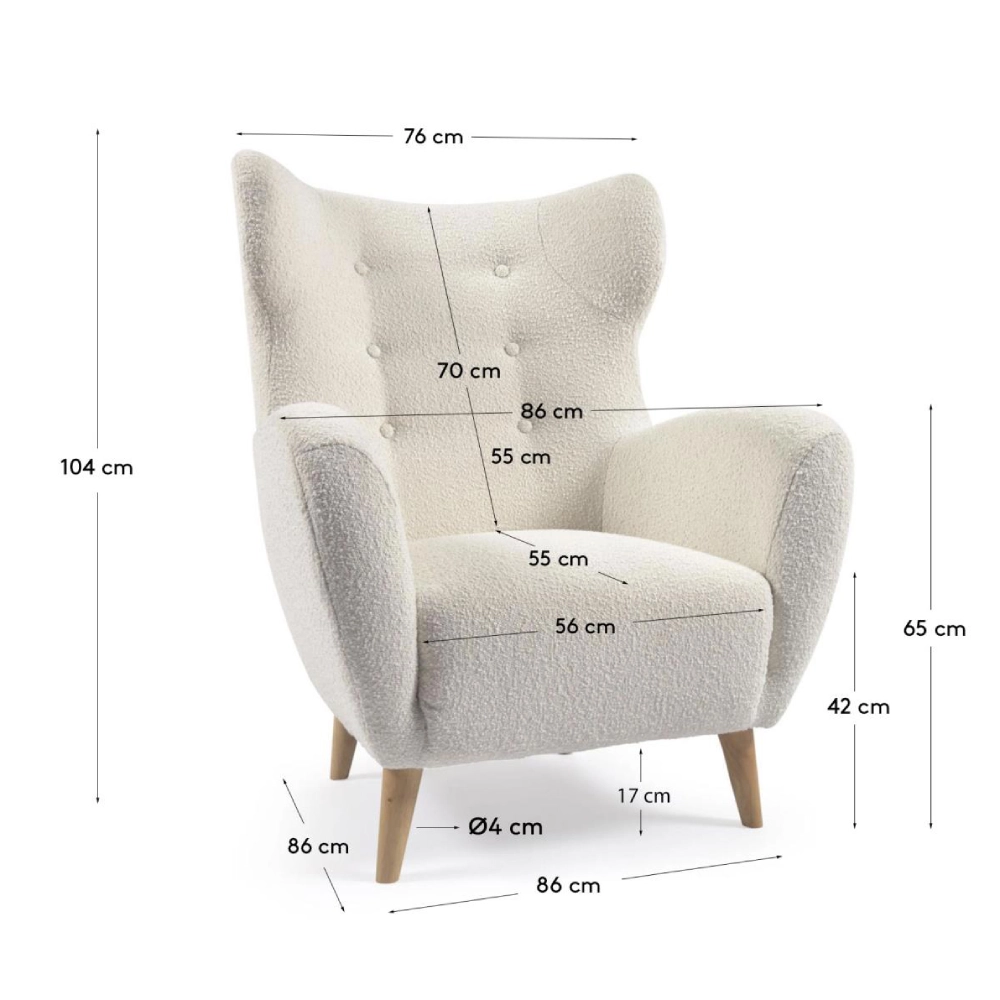 - O tecido bouclé branco oferece textura suave e um toque acolhedor, enquanto as pernas em madeira de faia natural reforçam o equilíbrio entre robustez e leveza visual.
