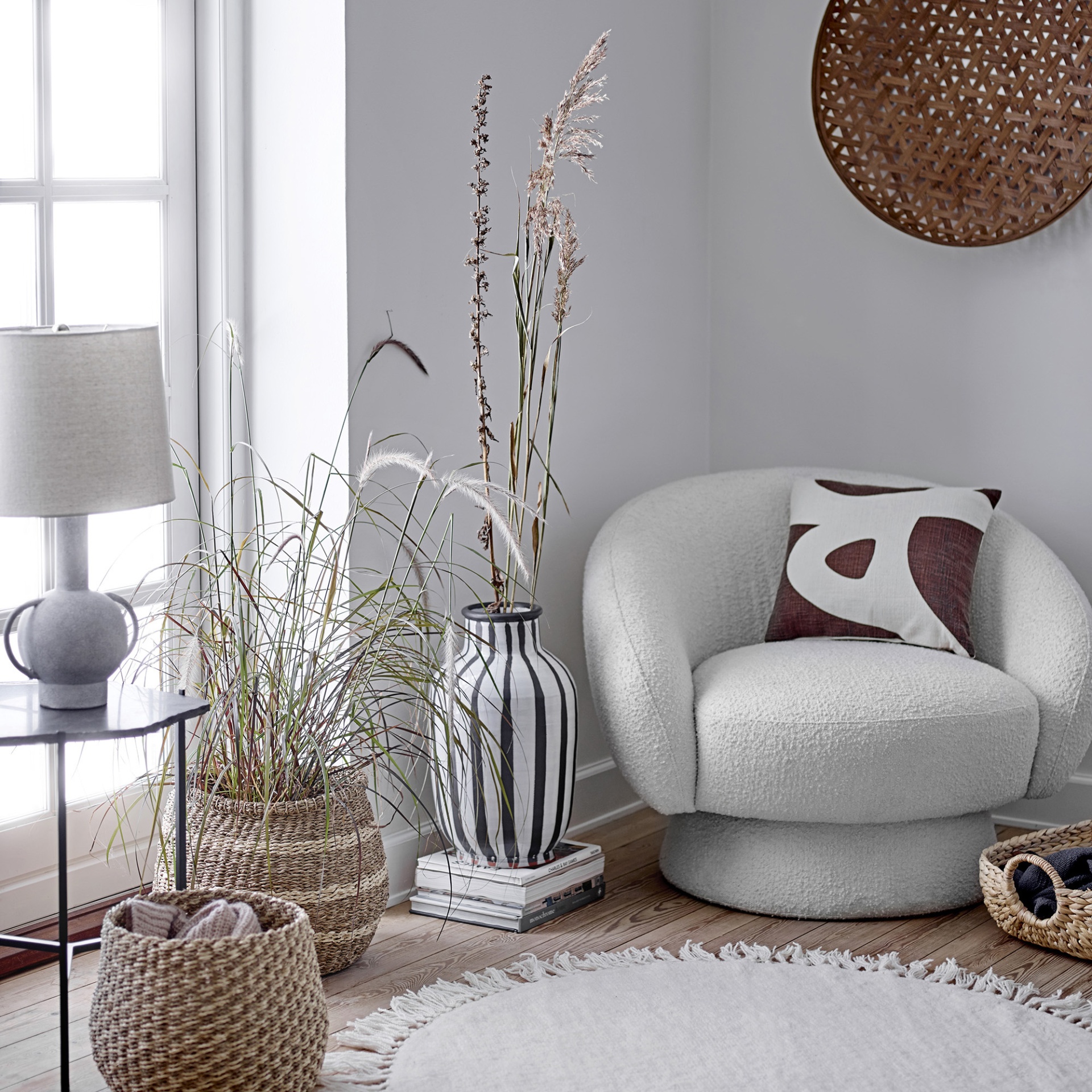 - Estrutura em madeira de pinho e estofada em tecido boucle.
