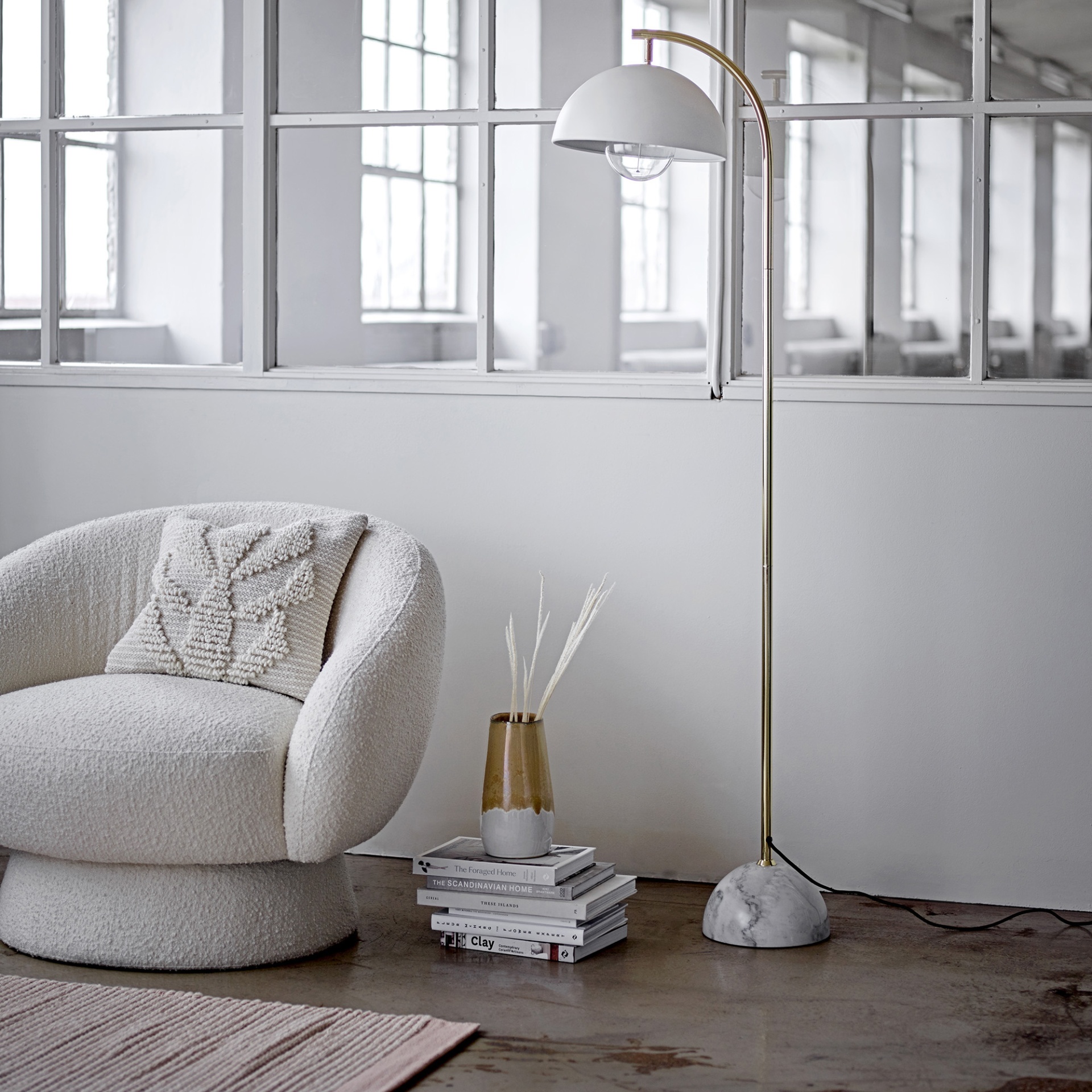 Poltrona Ted, estofada, bouclé, branco