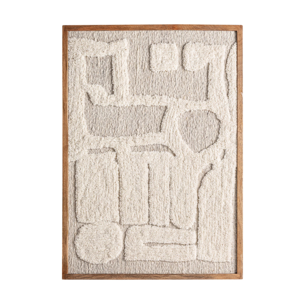 - O quadro Triton da Vical Home combina texturas têxteis em algodão com tons neutros e moldura em madeira de manga natural, resultando numa peça decorativa de inspiração contemporânea.