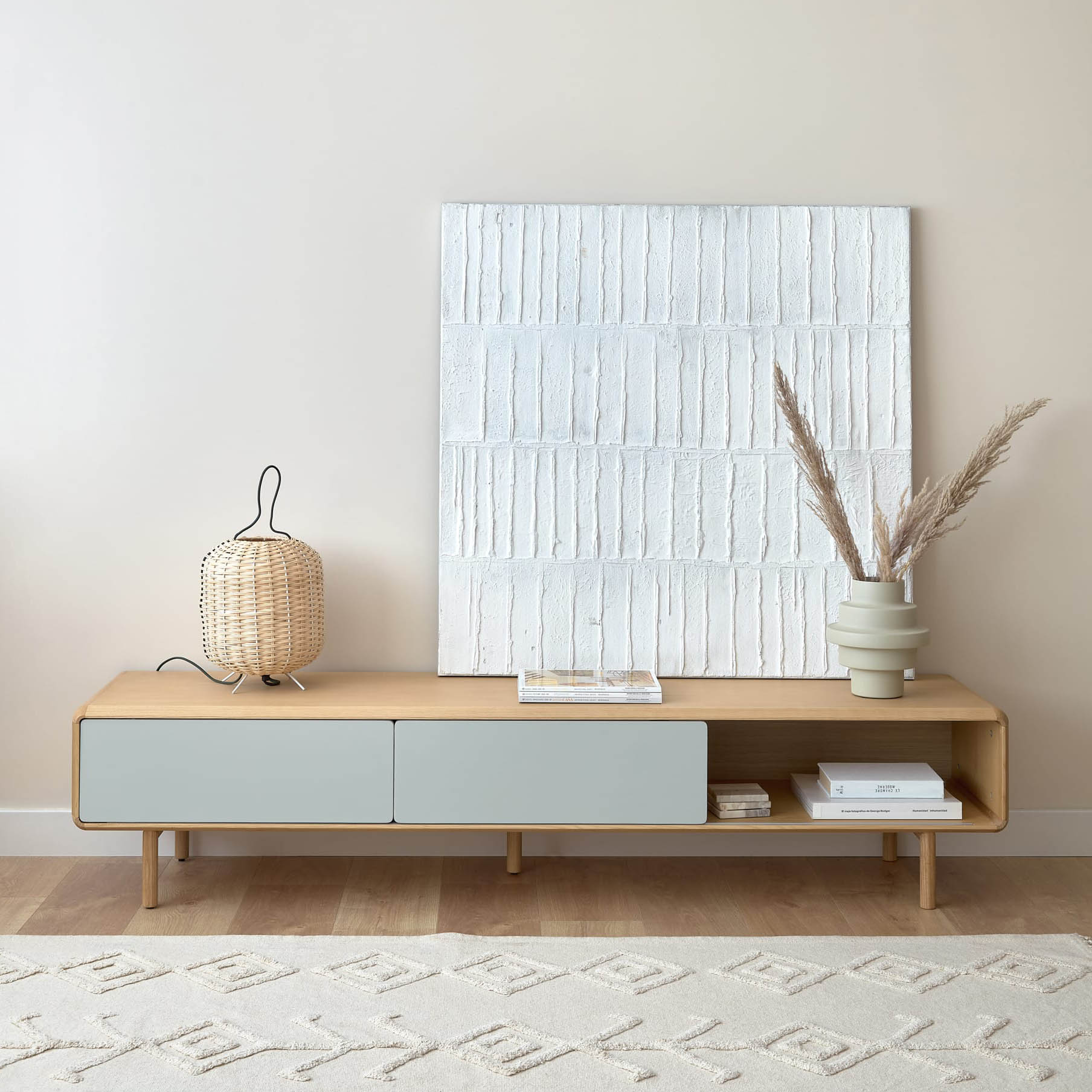 - O quadro Basil apresenta um estilo abstrato e minimalista, com foco na textura e na repetição de formas geométricas.