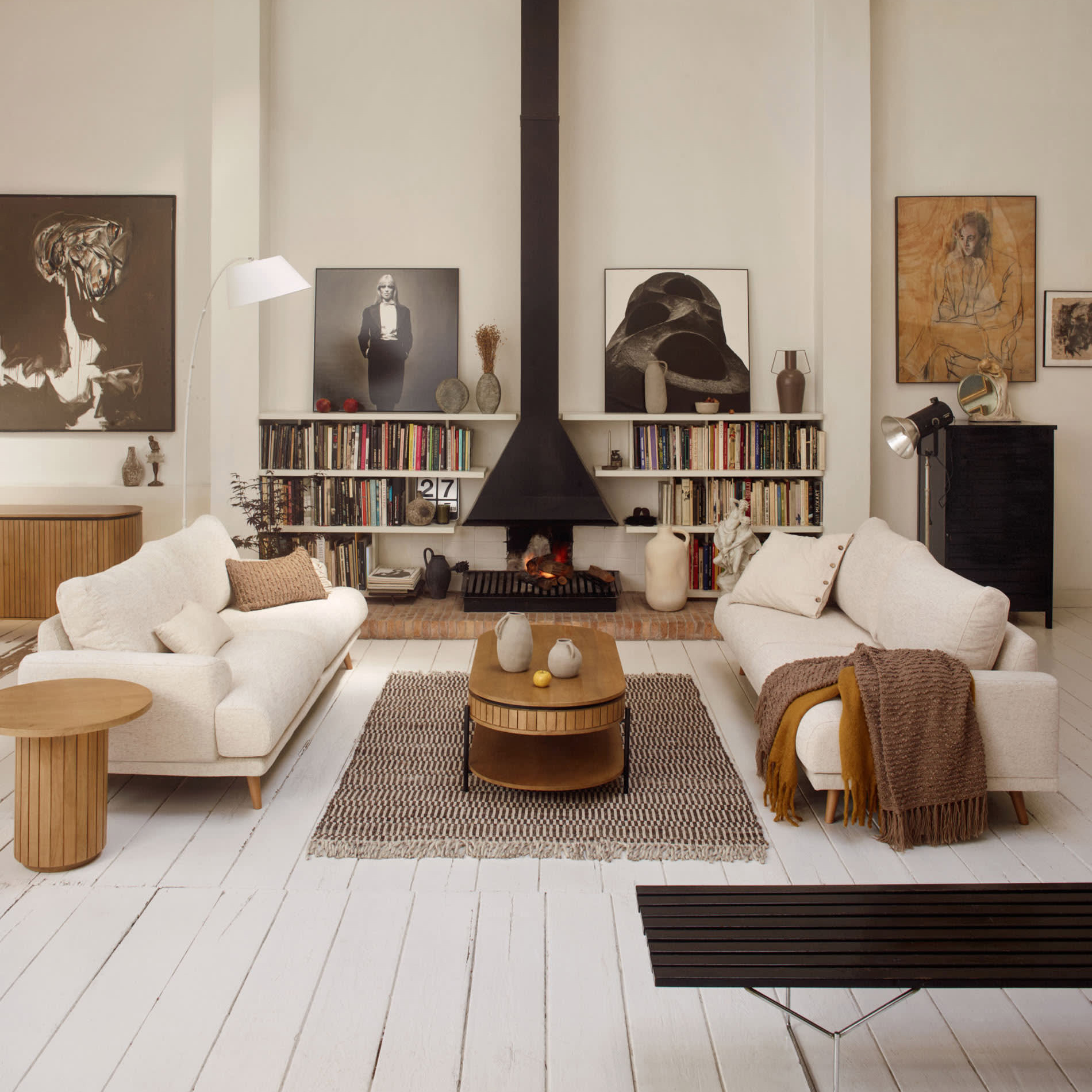 - Combina uma base estofada com apoios de braços arredondados integrados nos assentos e no encosto.