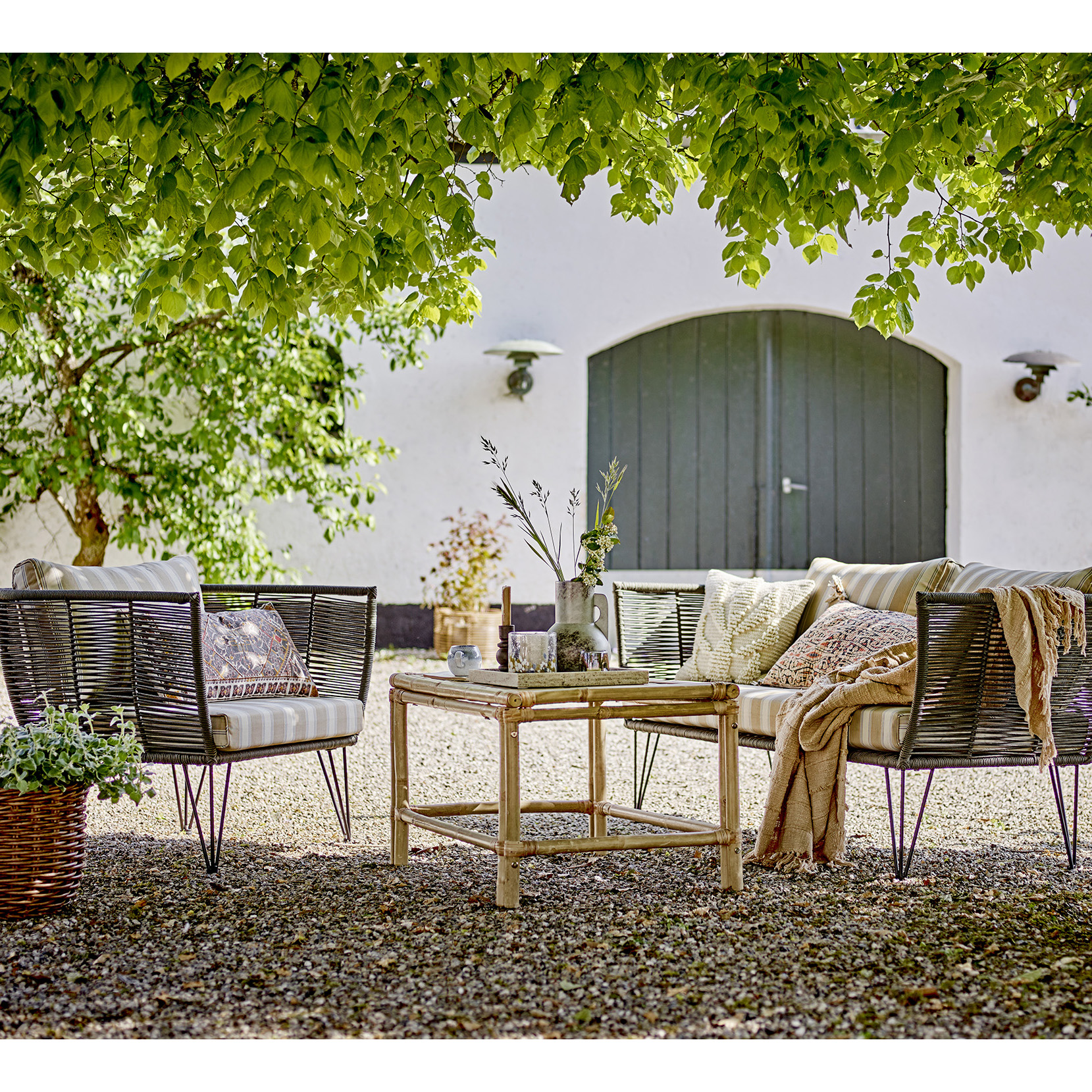 - O sofá Mundi da Bloomingville é feito de metal preto revestido a pó com uma corda de poliéster preta tecida à mão na estrutura.