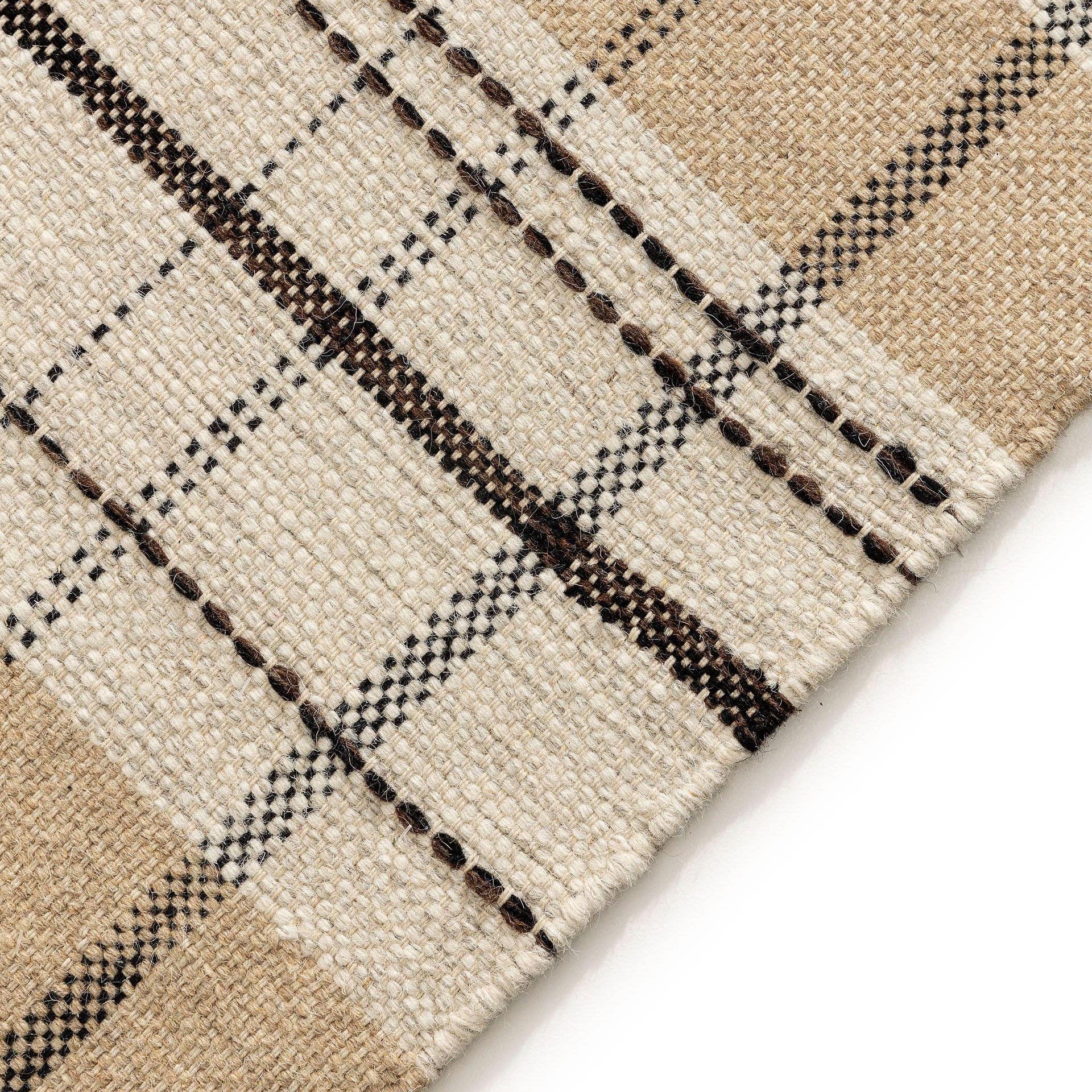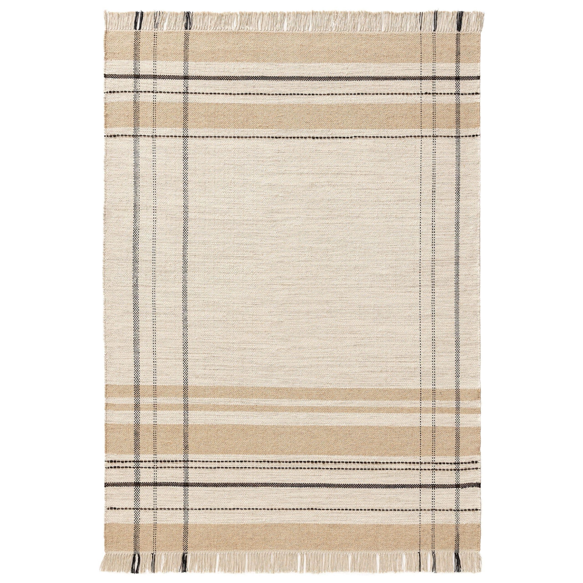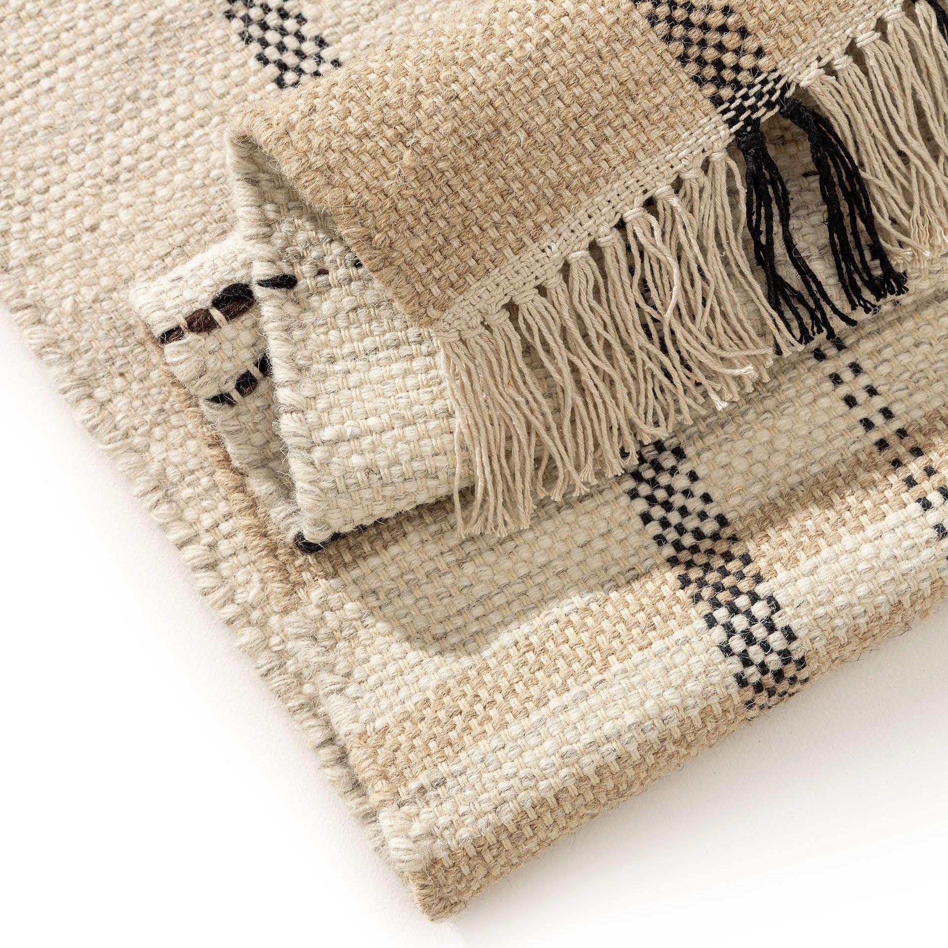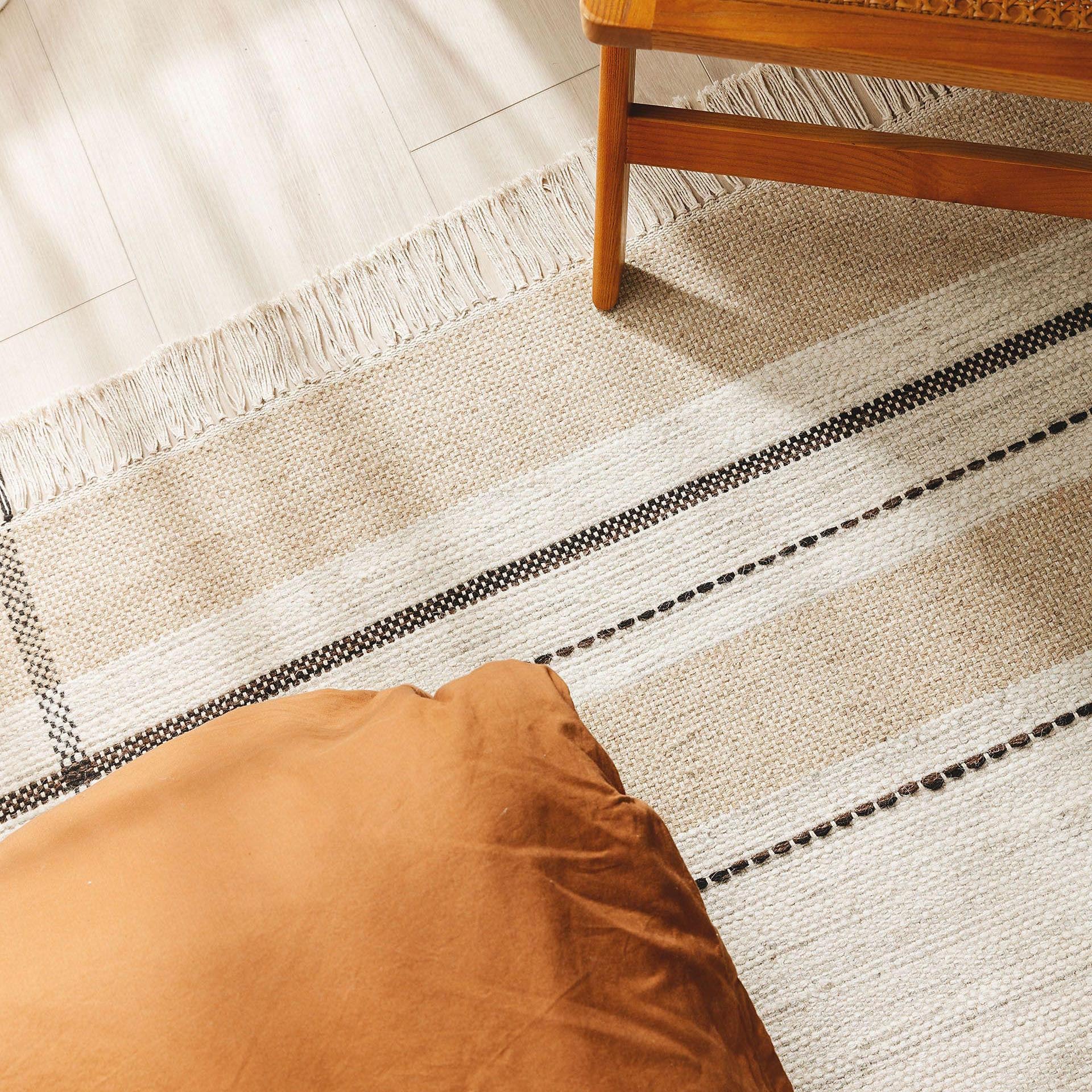 • Tapete retangular bege com padrão de linhas pretas e franjas nas extremidades