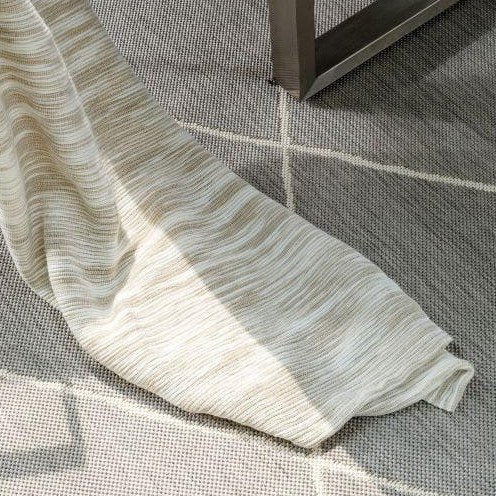 • Manta creme com listras sobre tapete cinzento com padrão geométrico