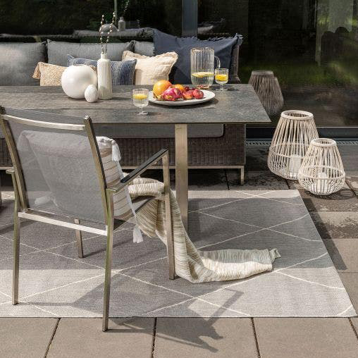 • Mesa de jantar cinza com cadeira metálica e tapete cinza em ambiente exterior