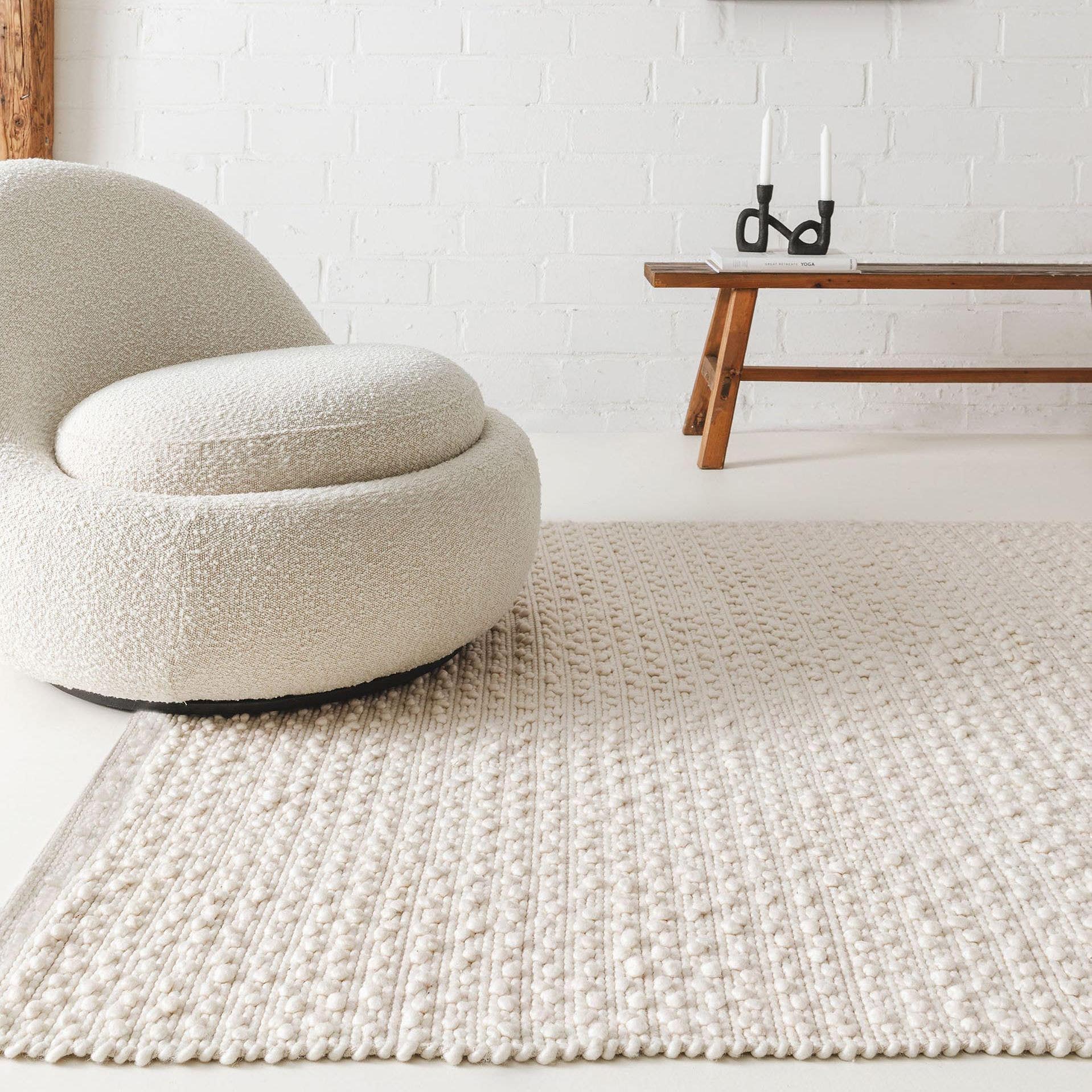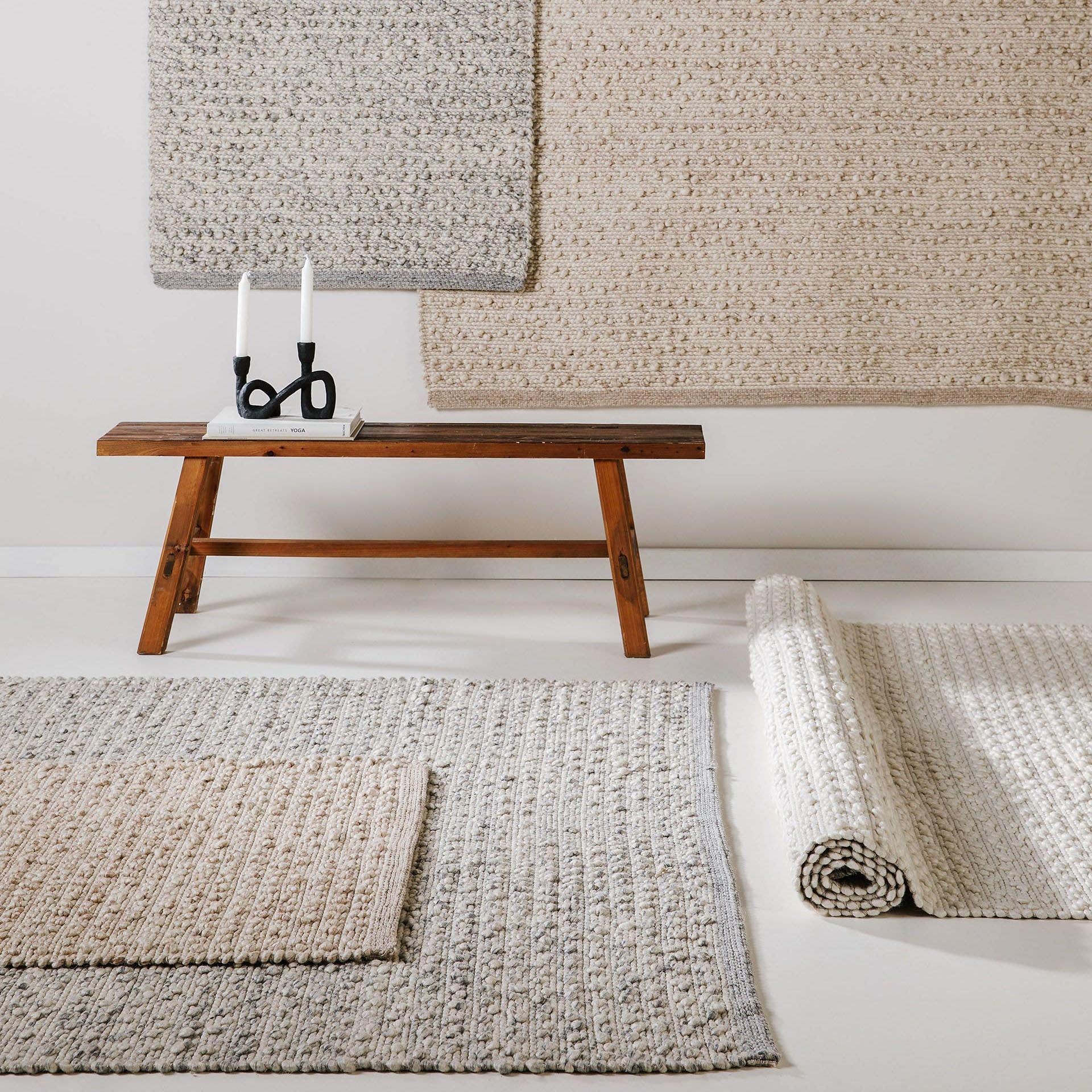 • Tapetes bege e cinza texturizados com banco de madeira e castiçais em cenário minimalista