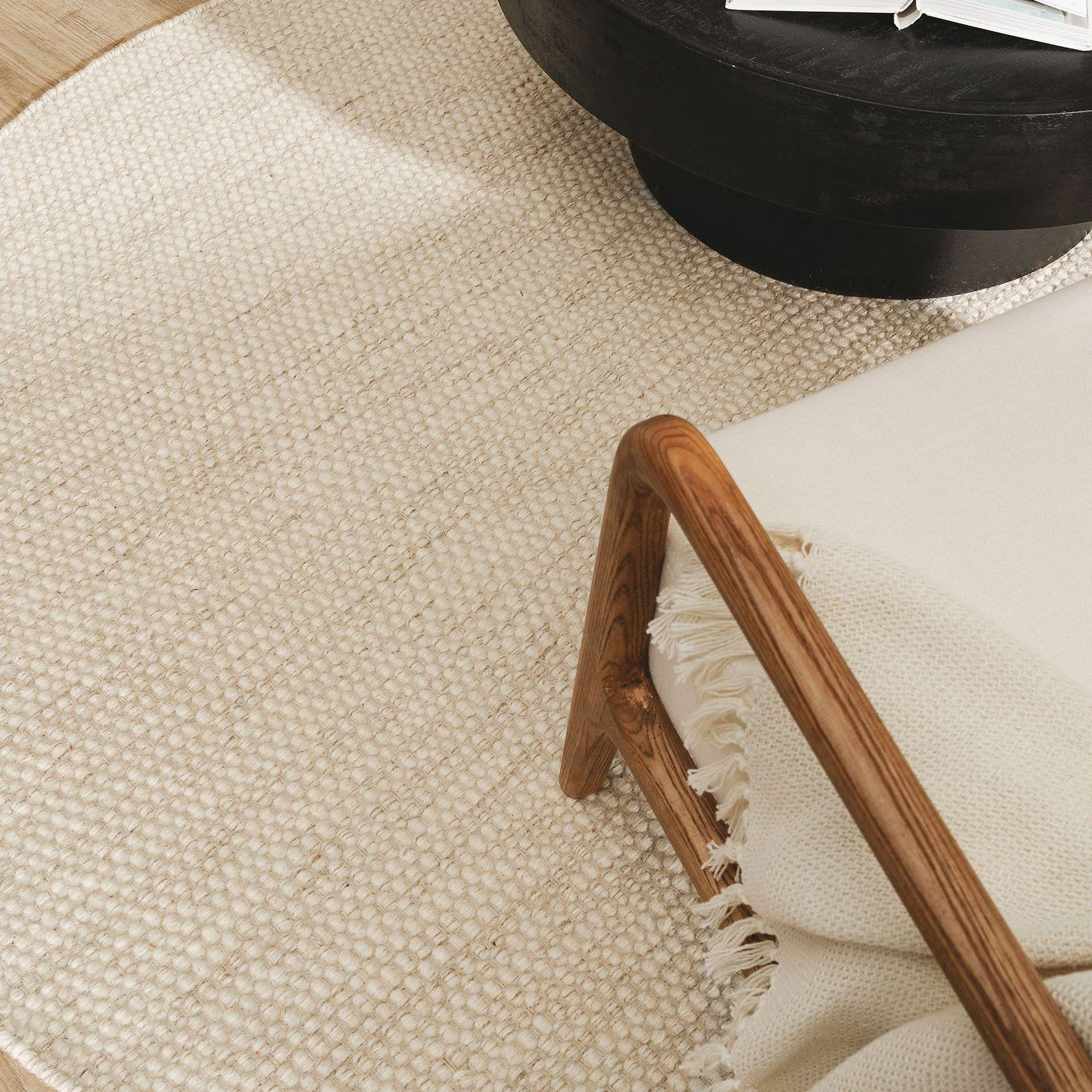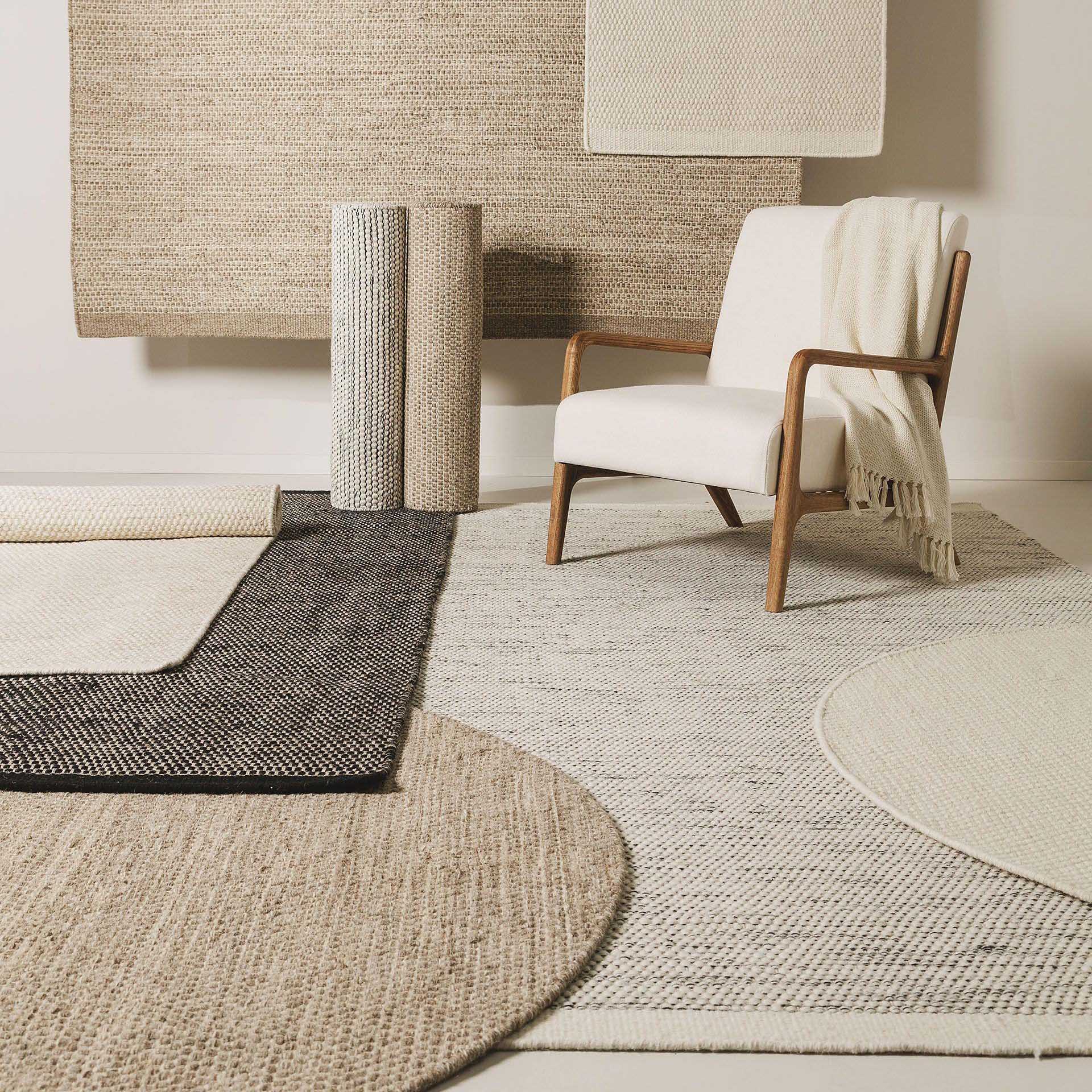 • Cadeira branca com manta e vários tapetes neutros em diferentes formas e texturas