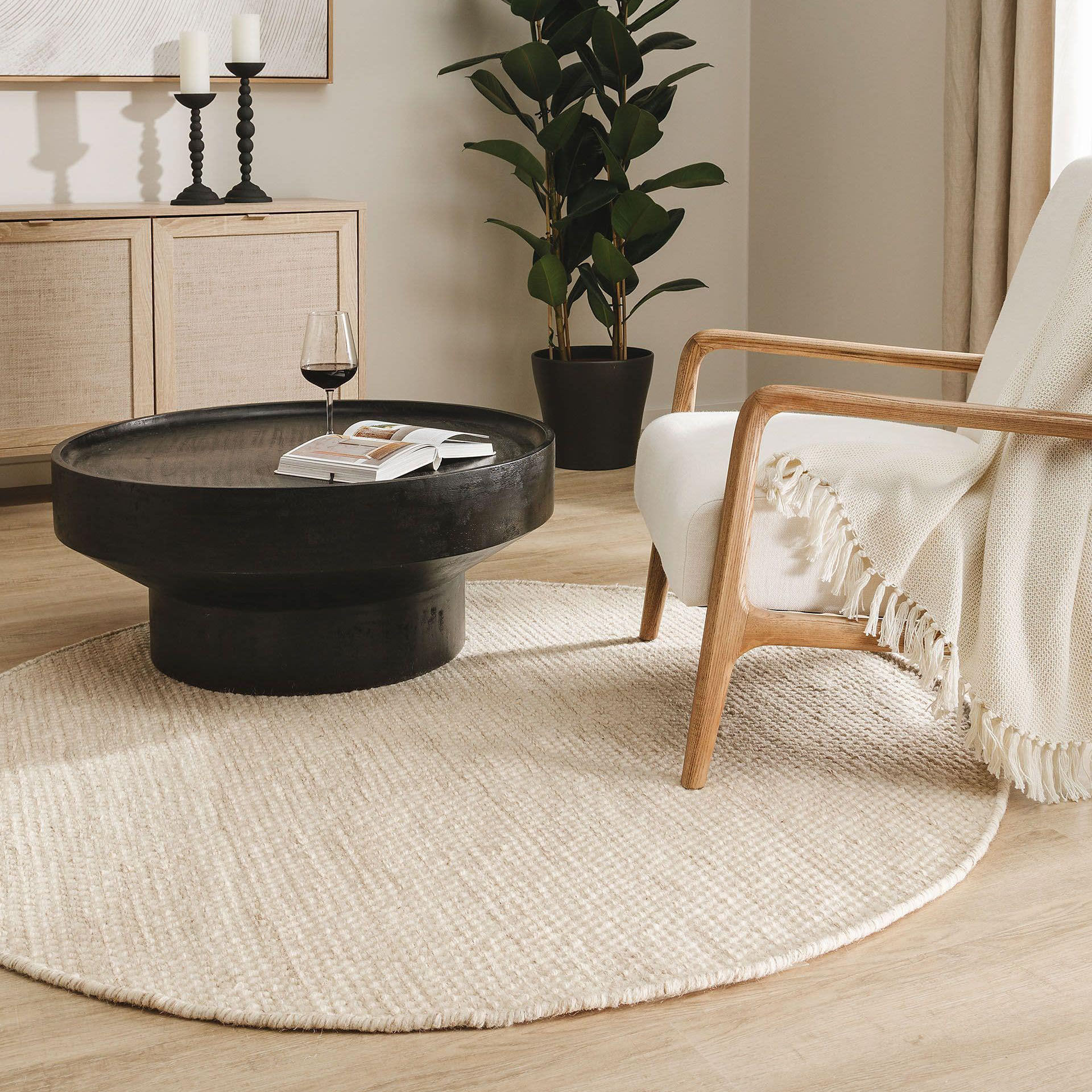 • Sala de estar com mesa de centro preta redonda, tapete redondo bege, cadeira de madeira clara com manta creme e planta em vaso preto