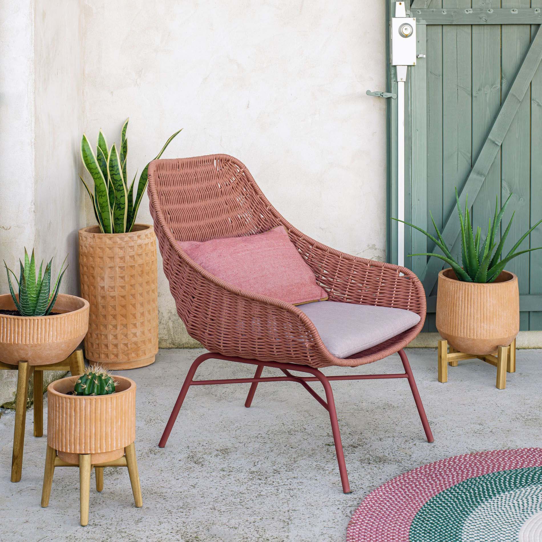 • Cadeira em vime sintético castanho com almofadas e vasos de plantas num espaço exterior