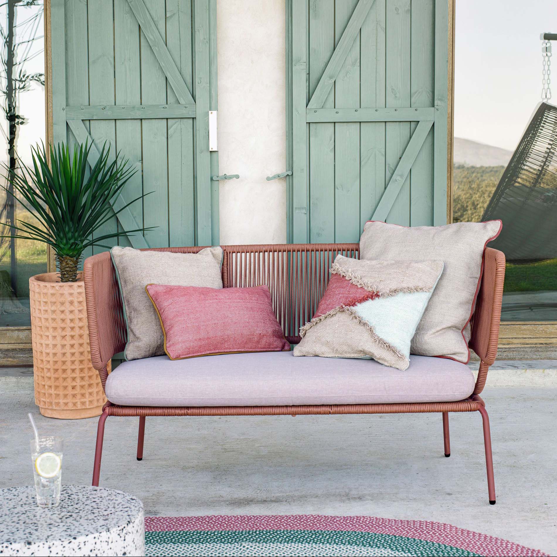 • Sofá exterior com almofadas coloridas em terraço com planta e porta verde-água