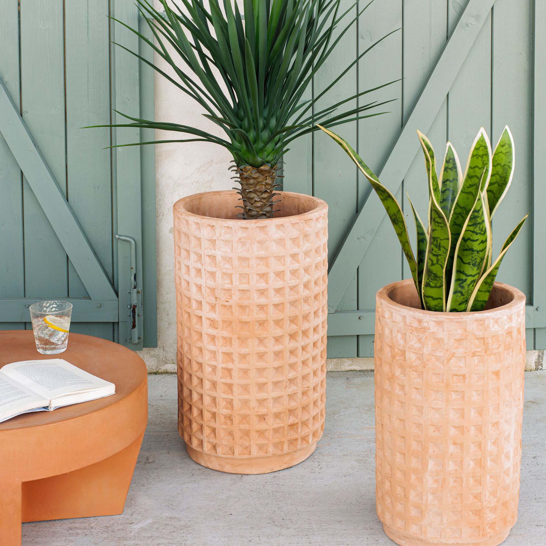 Dois vasos cilíndricos em terracota com padrão geométrico