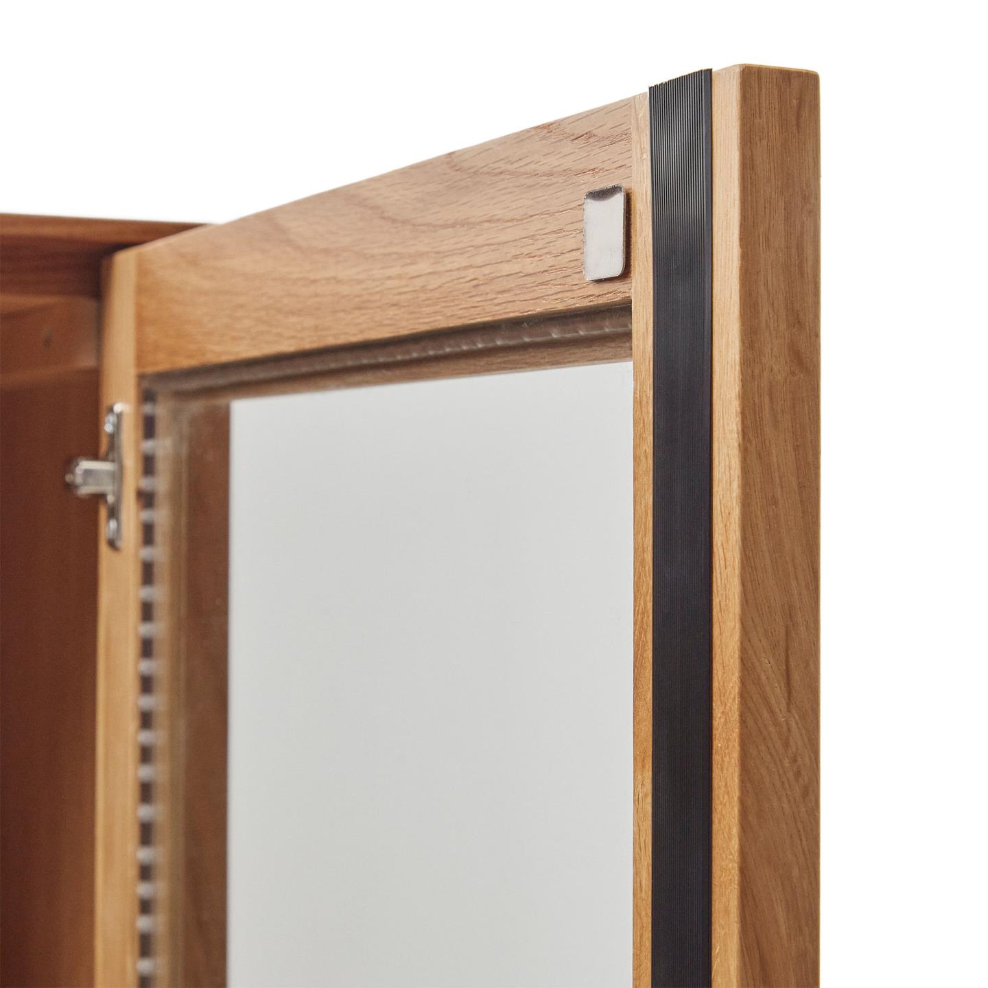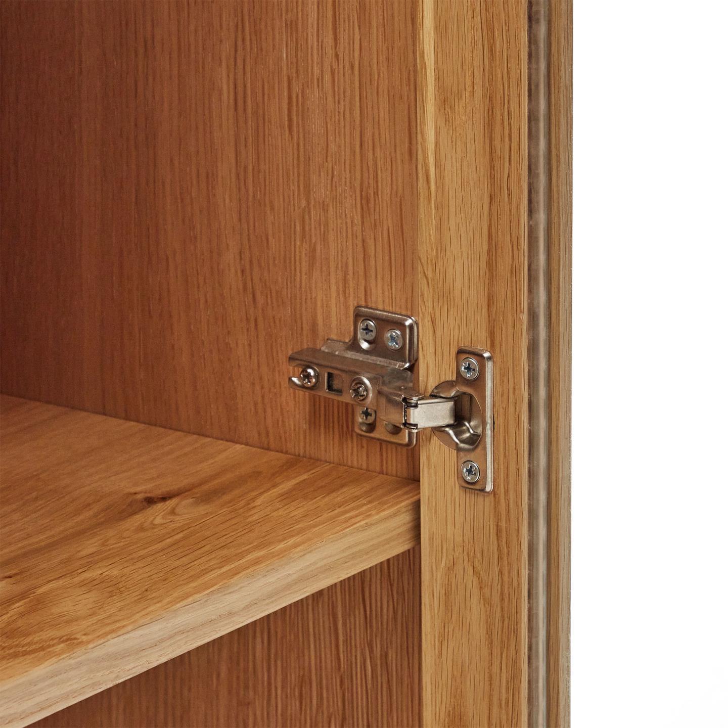 - Material das portas: MDF E0 (painel de fibra de densidade média com baixas emissões de formaldeído classe E0), Chapa de carvalho (Quercus alba)