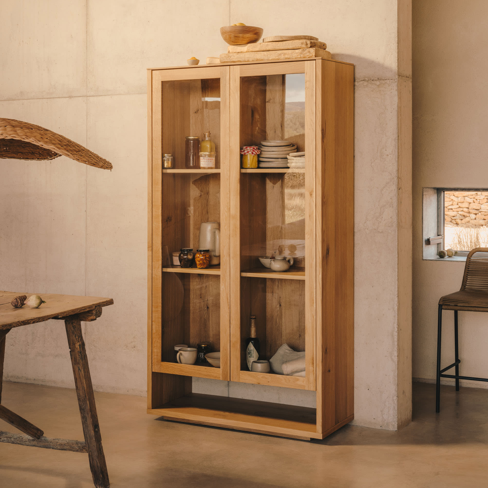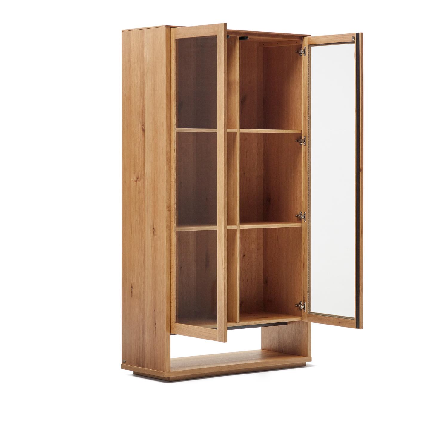 - A vitrina dispõe de pés reguláveis e é composta por duas portas em vidro com abertura por pressão e fecho suave.